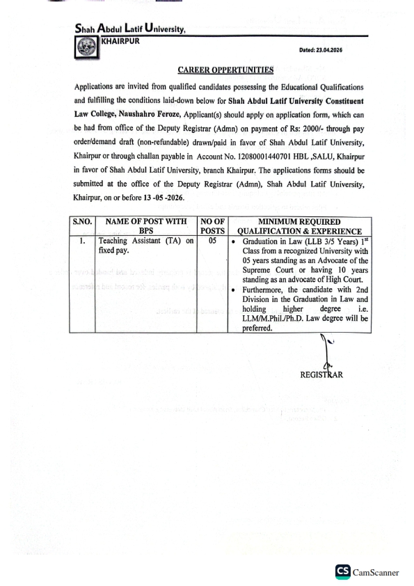Shah Abdul Latif University, Khairpur invites applications from qualified candidates for the position of Teaching Assistant (TA) at the Shah Abdul Latif University Constituent Law College, Naushahro Feroze. All applications must be submitted on or before May 13, 2026 For Details